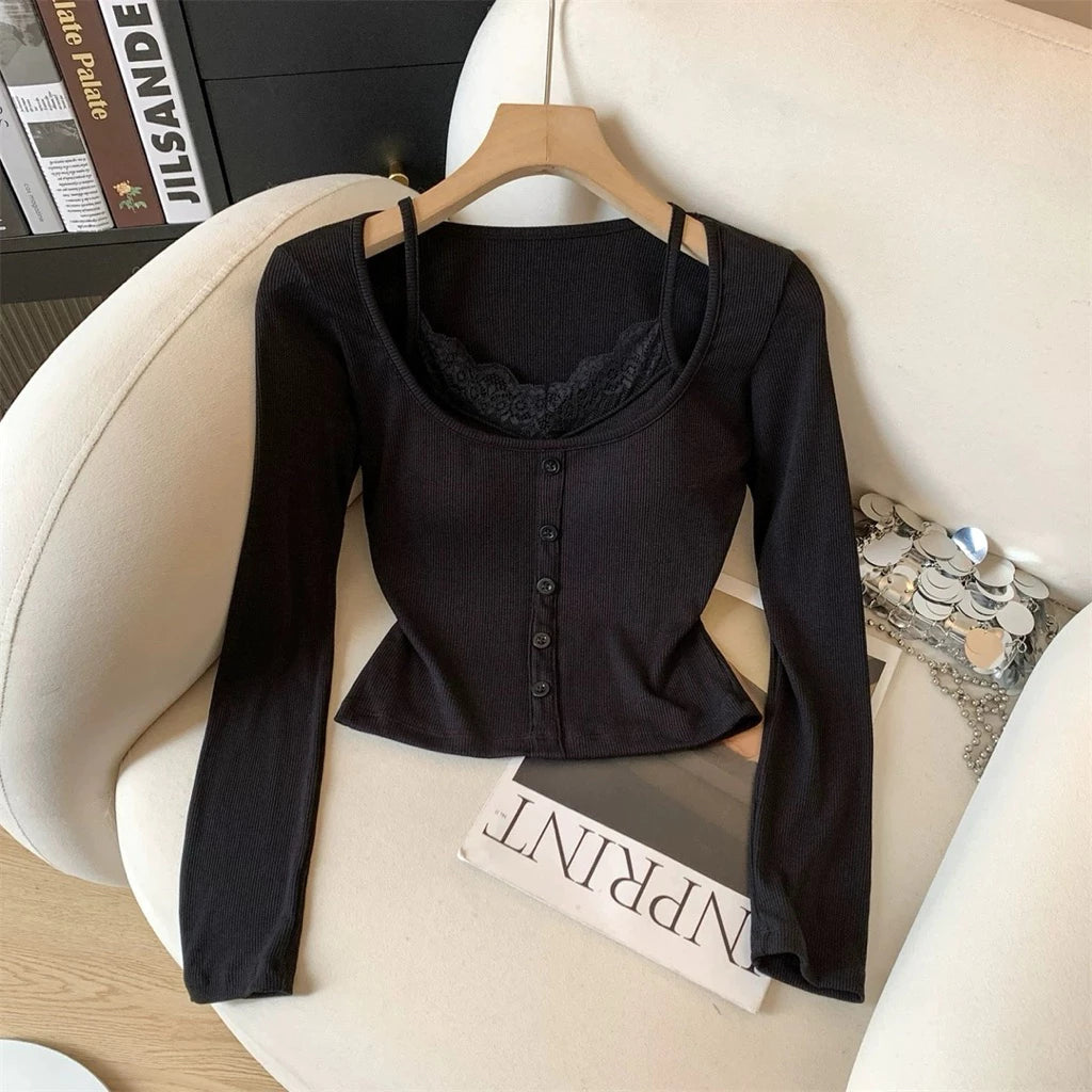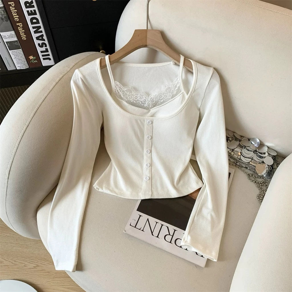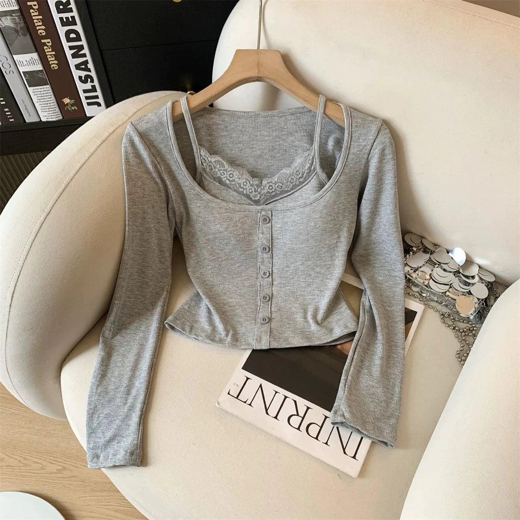 Cozy 小心機性感純慾蕾絲假兩件固定杯長袖上衣